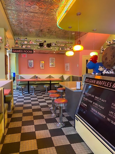 Old-school ice cream and waffle shop with lovely atmosphere and delicious food. They serving ice ceeam with fresh cooked cone. Server lady was very cute and helpful.